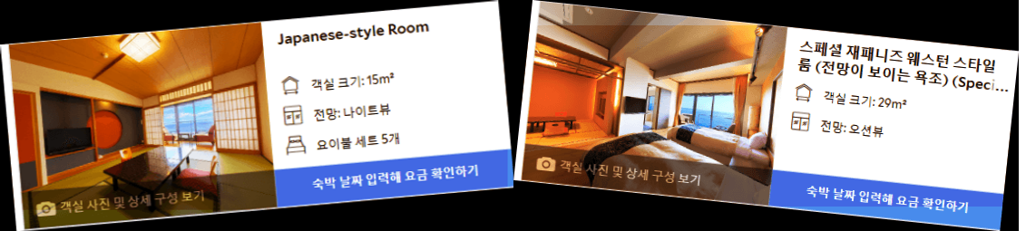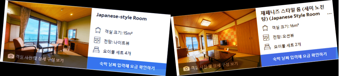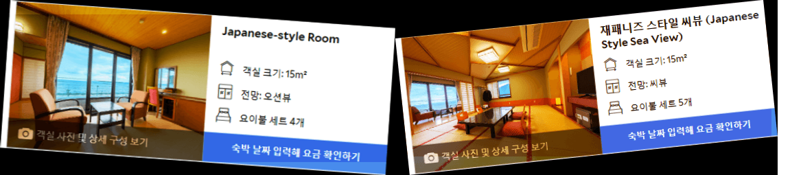 우선 료칸에 대해 궁금해하셨는데, 어떤 불편함도 전혀 없었습니다. 시설물 관리가 훌륭하여 오래된 냄새나 노후된 느낌이 전혀 없었어요. 온천과 실내 욕실이 둘 다 있어 편리했고, 평일에는 가족만 즐길 수 있는 바다 전망 노천탕이 있어 마치 파라다이스 같았어요.